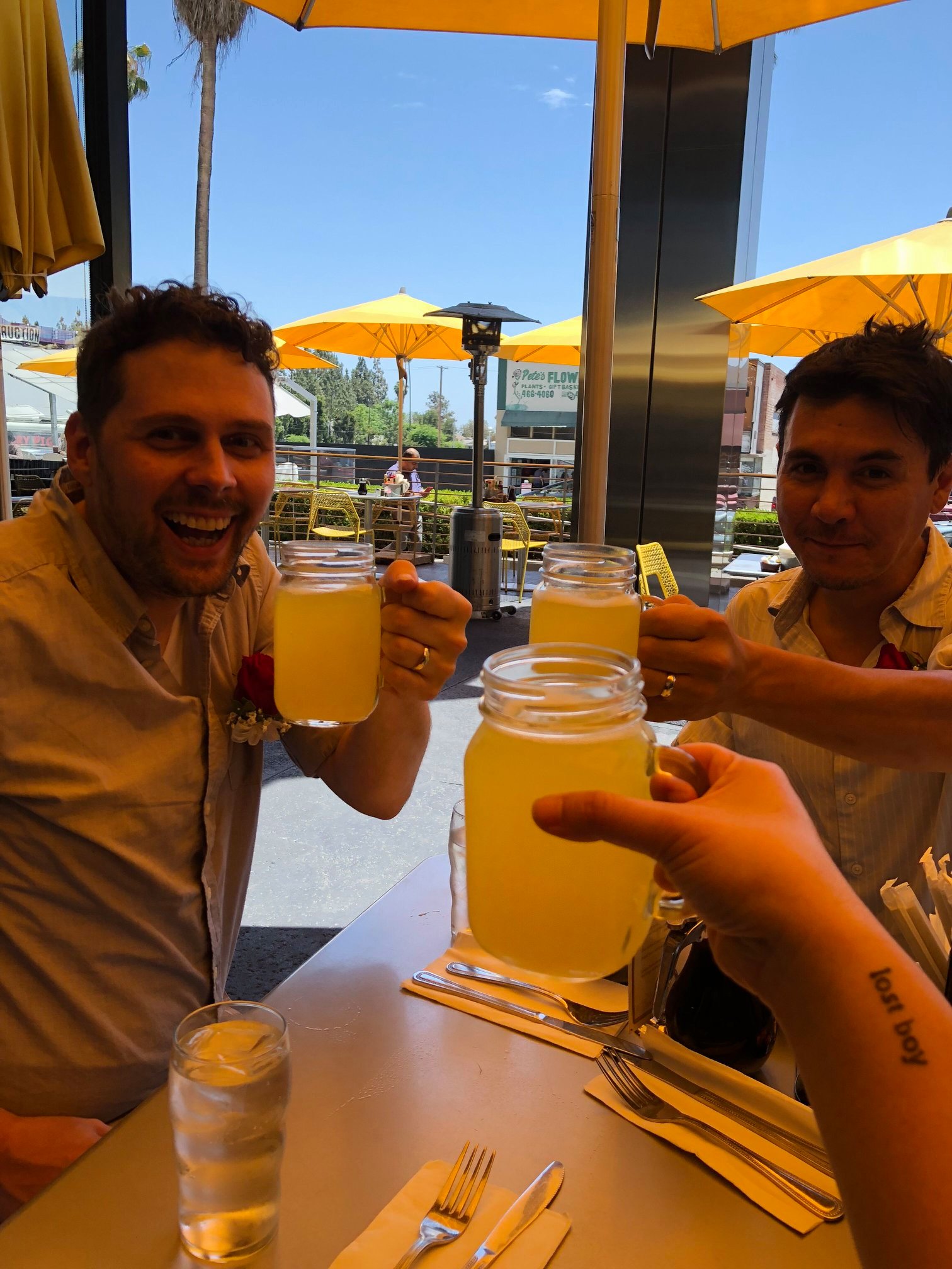 Dan and ToÑo asked if I would be their witness when they got married. It was on July 11th and I remember this clearly because they were amused it was like’ 7/11’ and also it was 100000 degrees because it was the middle of summer here in LA and I remember they cut and hand-sewn their pants into shorts. I brought them matching boutonnieres to wear and I had the honor of watching them recite their vows to each other in someone’s living room. It was all so simple, so perfect. It was really quite lovely. We celebrated the day with waffles and mimosas. Because, well, why not?